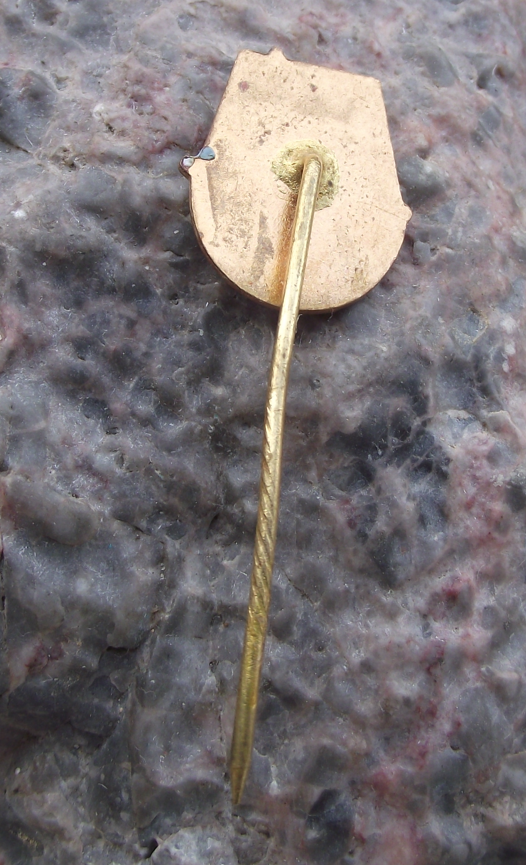 A pretty souvenir pin badge from CSAD in Brno in former Czechoslovakia. The badge face is 1.9cm high, made from a gold coloured metal and has a stick pin fastener to the rear.