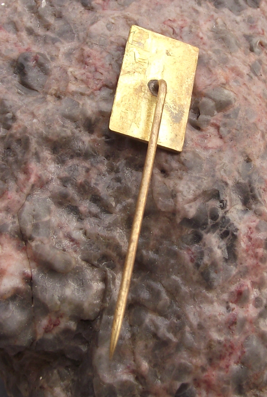 The badge is made of a gold coloured metal. The badge face is 1.7cm high with a long stick pin fastener to the rear.