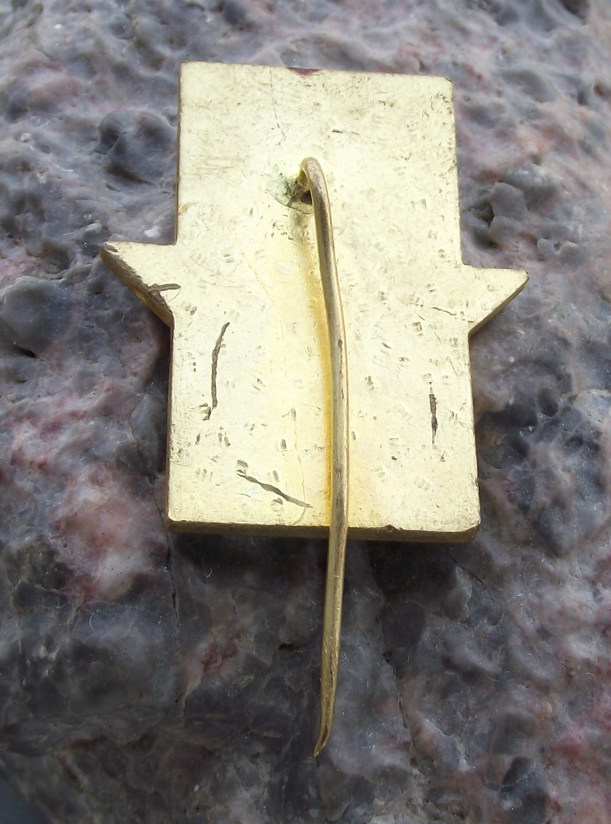 A gold coloured metal badge with a 3.2cm high face and a long, stick pin style fastener to the rear.