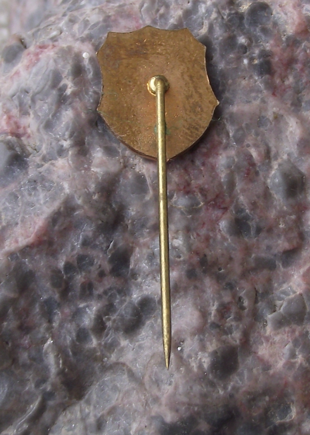 - The badge face is 1.5cm high, made of a gold coloured metal and has a long, stick pin style fastener.
