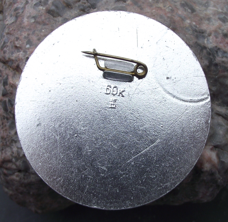 The badge face is 5cm high and has a safety clasp style fastener to the rear. The badge is made from a light metal, probably aluminium and features the Olympic rings and a globe logo with a red star and coloured ribbons.