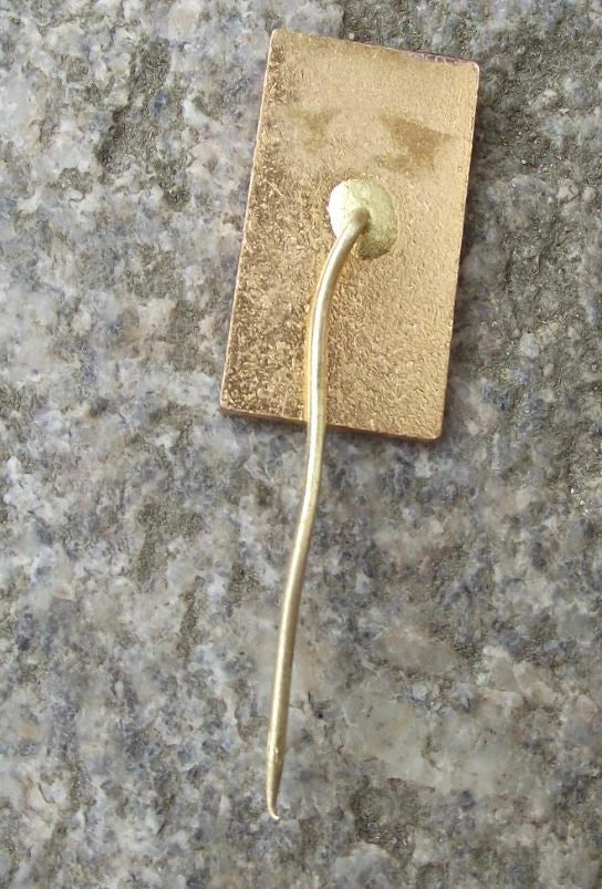 Made from a gold coloured metal. The badge face is 2.6cm high and has a long stick pin style fastener to the rear.