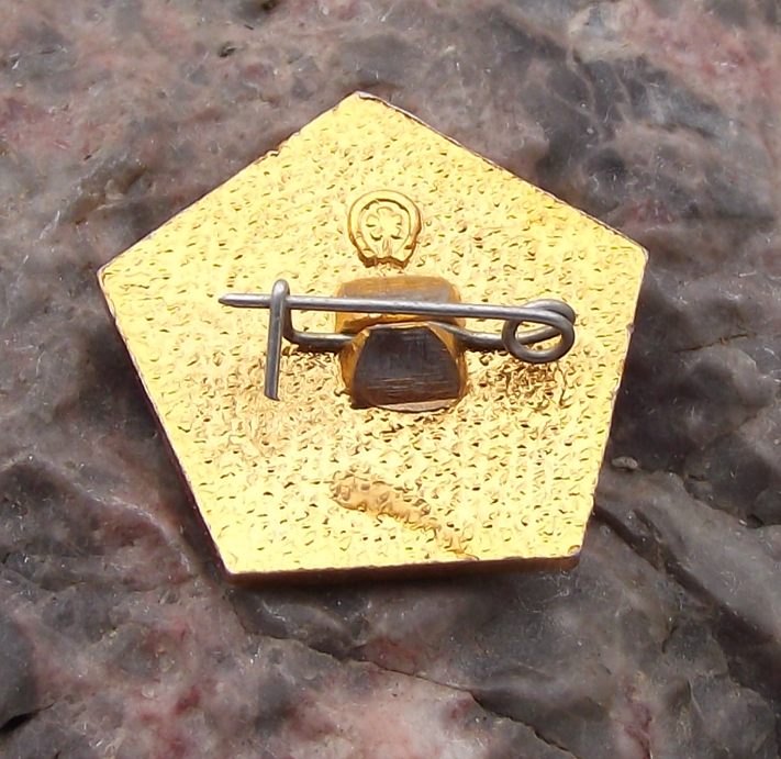 Made from a gold coloured metal, the badge face is 2.1cm wide and has a safety clasp style fastener to the rear.