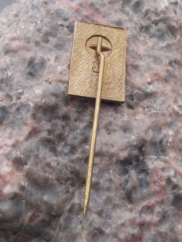 - A 1980 gold coloured metal hunting themed pin from former Czechoslovakia, the badge face is 2cm high and has a long, stick pin style fastener to the rear. Featuring the skull head of a buck deer with antlers. The text reads Nitra 1980 and refers to the Slovak All State Hunting Trophy Exhibition