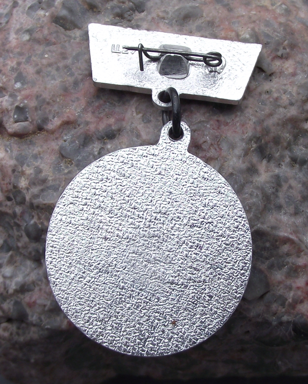 The badge face is 4.8cm high and has a safety clasp style fastener to the rear. The badge is made from a light metal, probably aluminium and features the Olympic rings and coloured ribbons with the text MOSCOW 80