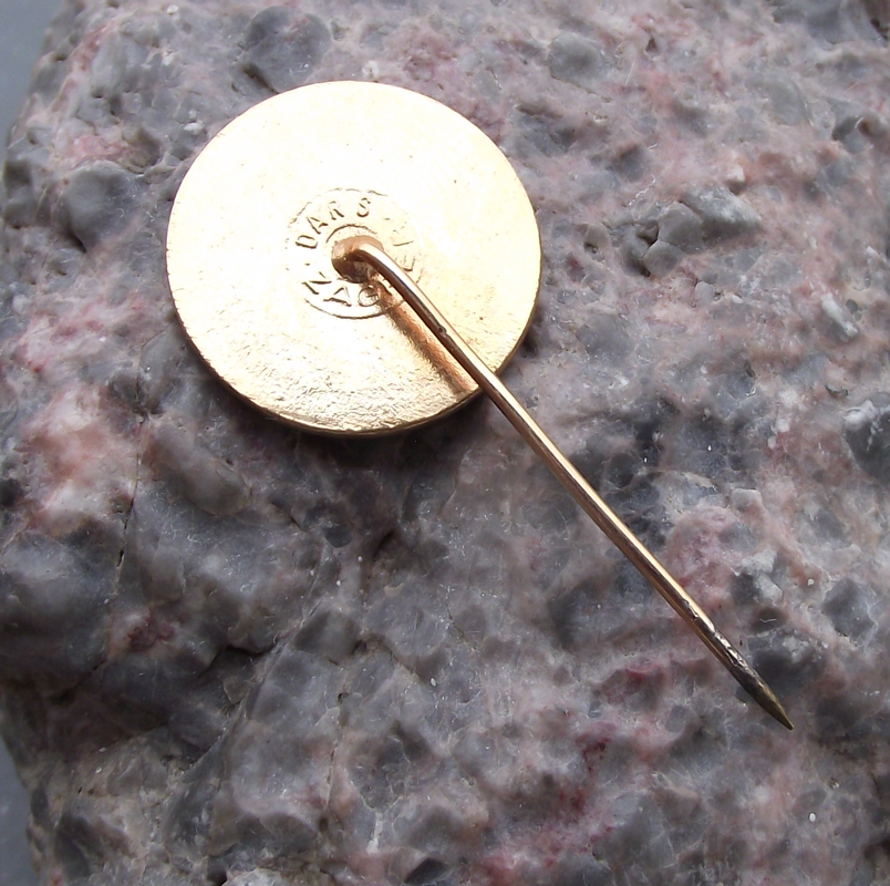 A vintage coloured metal hunting themed pin from Croatia, the badge face is 2.1cm high and has a long, stick pin style fastener to the rear. Featuring the text 'godina lovstva u hrvatskoj', it celebrates the 100th anniversary of the Hunting association of Croatia.