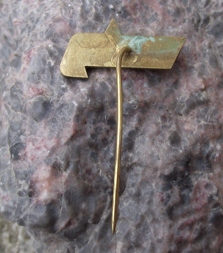 - The badge has a long stick pin style fastener and is 2.6cm wide.