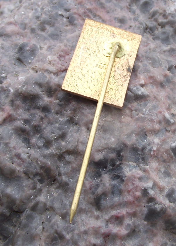 A 1983 gold coloured metal hunting themed pin from former Czechoslovakia, the badge face is 2cm high and has a long, stick pin style fastener to the rear. Featuring the text 'IV Sjezd CMS 1983', it would have been worn by attendees of this 4th Sjezd (meeting) of the 'Cesky Myslivecky Svaz', it would have been worn by members of the CMS or 'Czechoslovak Hunters Association'.