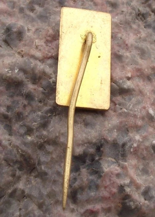 A gold coloured metal badge with a 2.2cm high face and a long, stick pin style fastener to the rear.