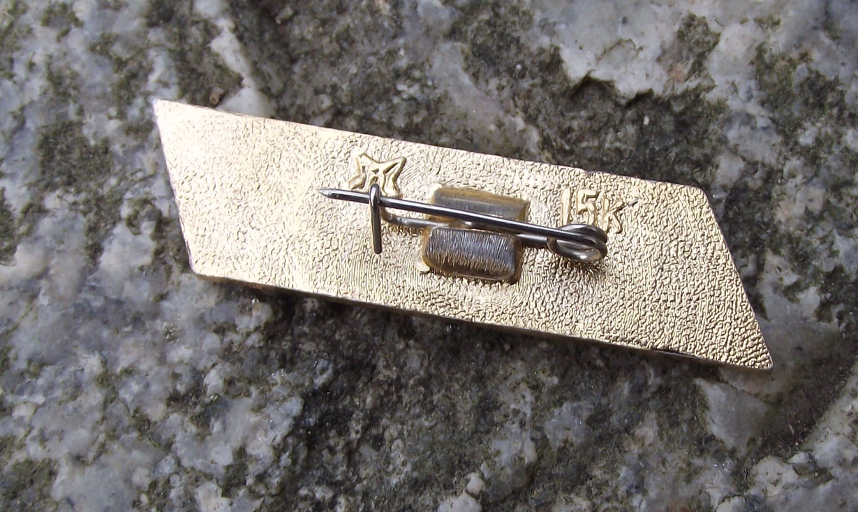 - This badge is 3.5cm wide and made from a gold coloured metal with a safety clasp style fastener to the rear.