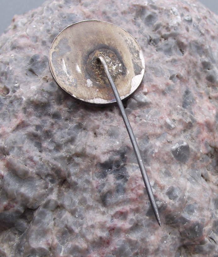 A vintage silver coloured metal hunting themed pin from former Czechoslovakia, the badge face is 2.6cm in diameter and has a long, stick pin style fastener to the rear. Featuring the text 'Brno 85 Hunting and Countryside', it would have been worn by attendees of the 1985 event in Brno.