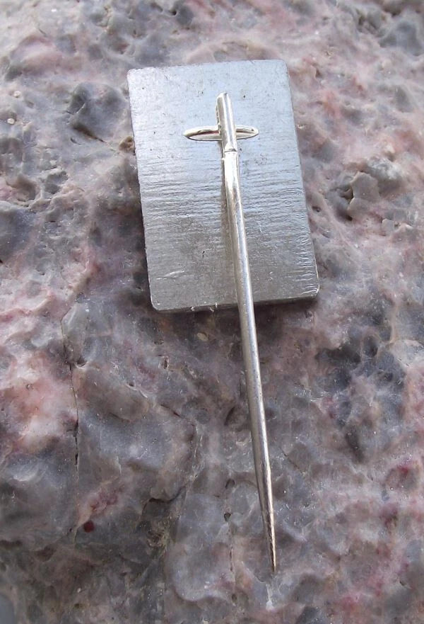 A gold coloured metal badge with a 2.2cm high face and a long, stick pin style fastener to the rear.
