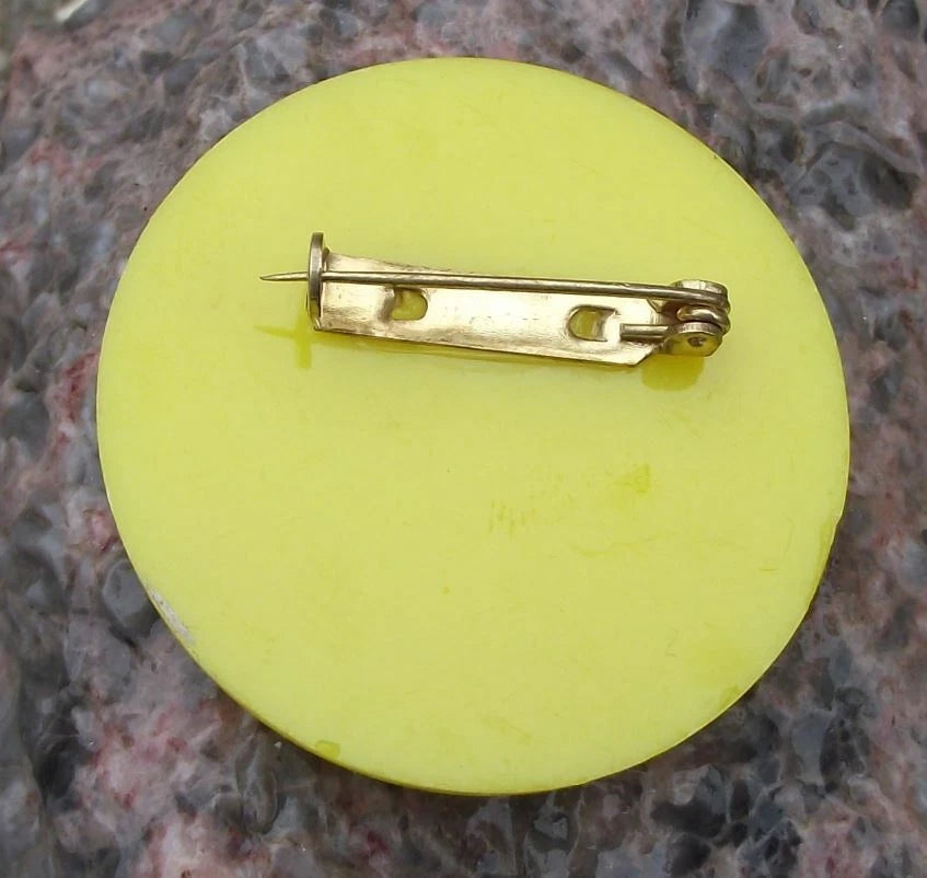 The yellow coloured plastic badge. The face is 3.8cm in diameter and has a safety clasp style fastener to the rear.