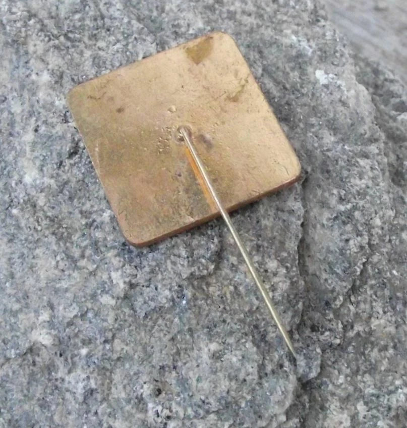 A gold coloured metal badge with a 2.3cm wide face and a long, stick pin style fastener to the rear.