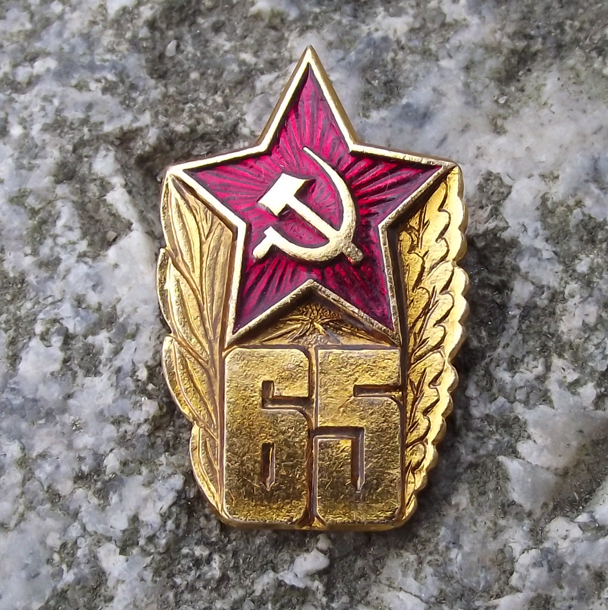 The text on the pin face features the number 65 with the Soviet hammer and sickle motif.
