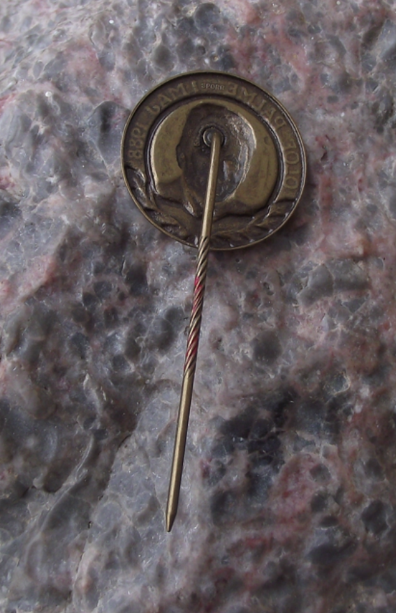 - The badge has a long stick pin style fastener and is 1.7cm in diameter.