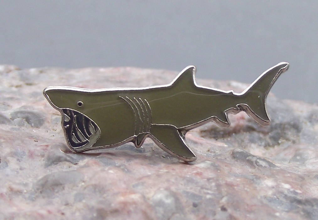 - A pretty, wildlife pin badge featuring a basking shark. The badge face is 2.5cm wide and has a modern butterfly clasp style fastener to the rear.