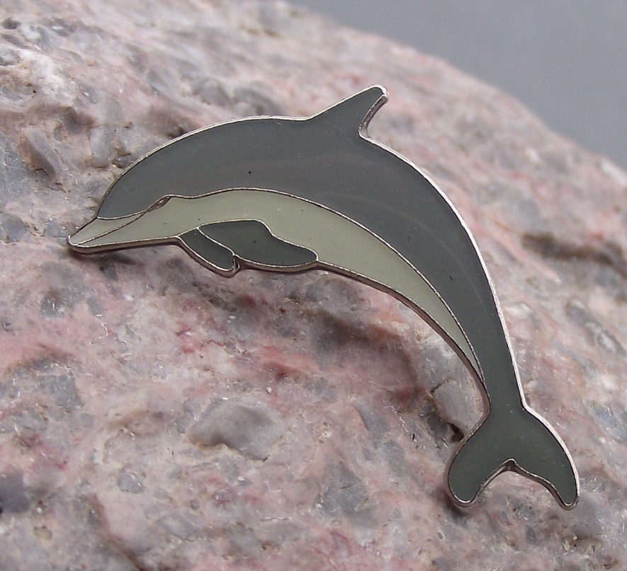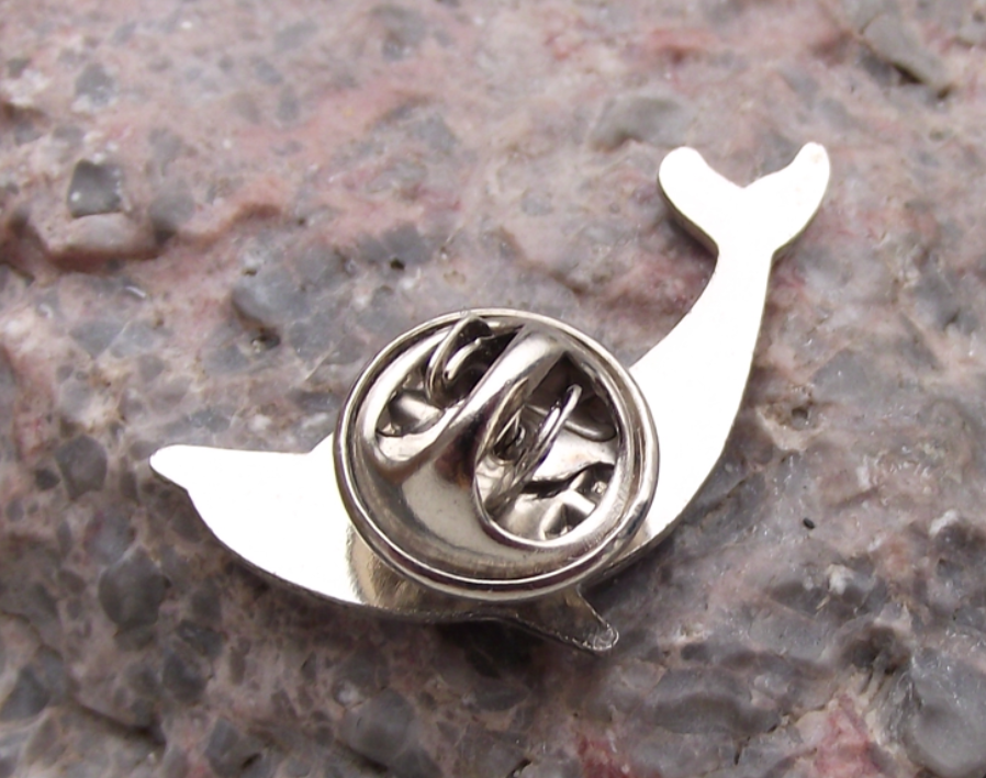 - A pretty, wildlife pin badge featuring a Dolphin. The badge face is 3cm wide and has a modern butterfly clasp style fastener to the rear.