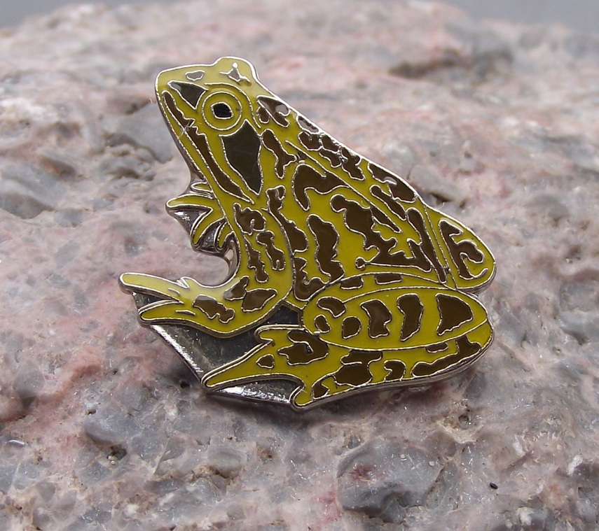 - A pretty, wildlife pin badge featuring a frog. The badge face is 3cm wide and has a modern butterfly clasp style fastener to the rear.