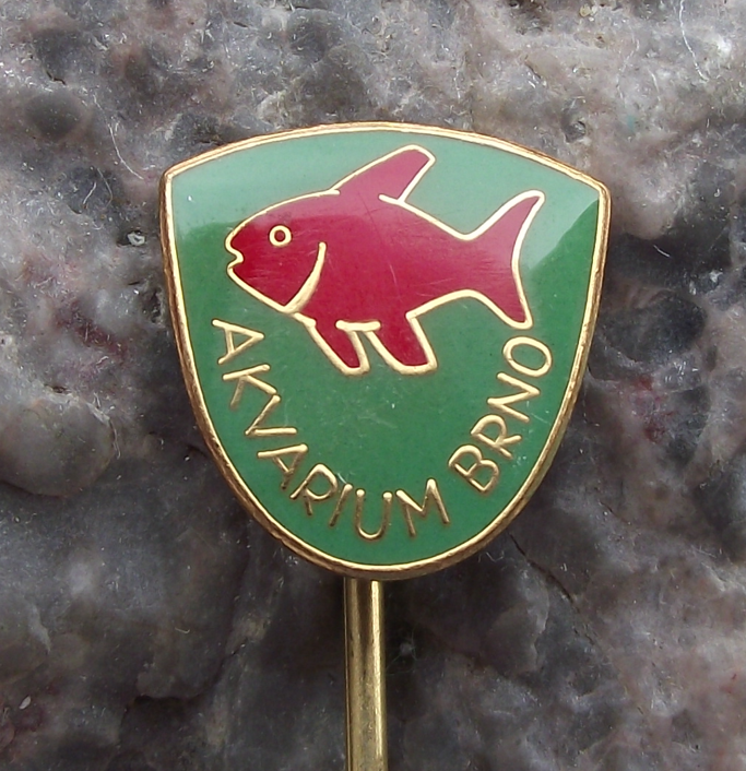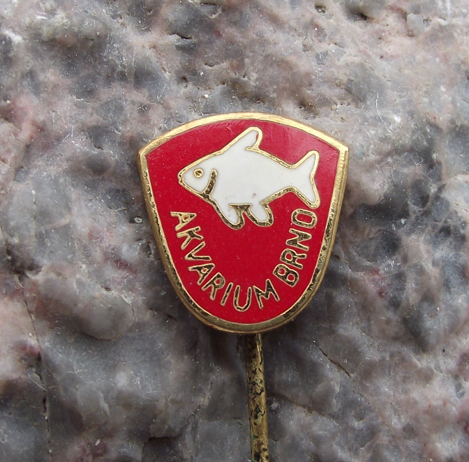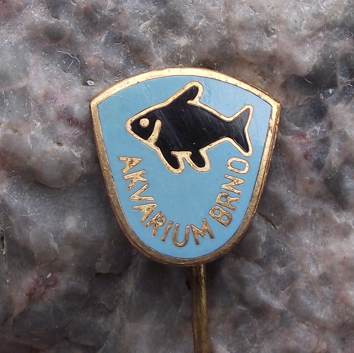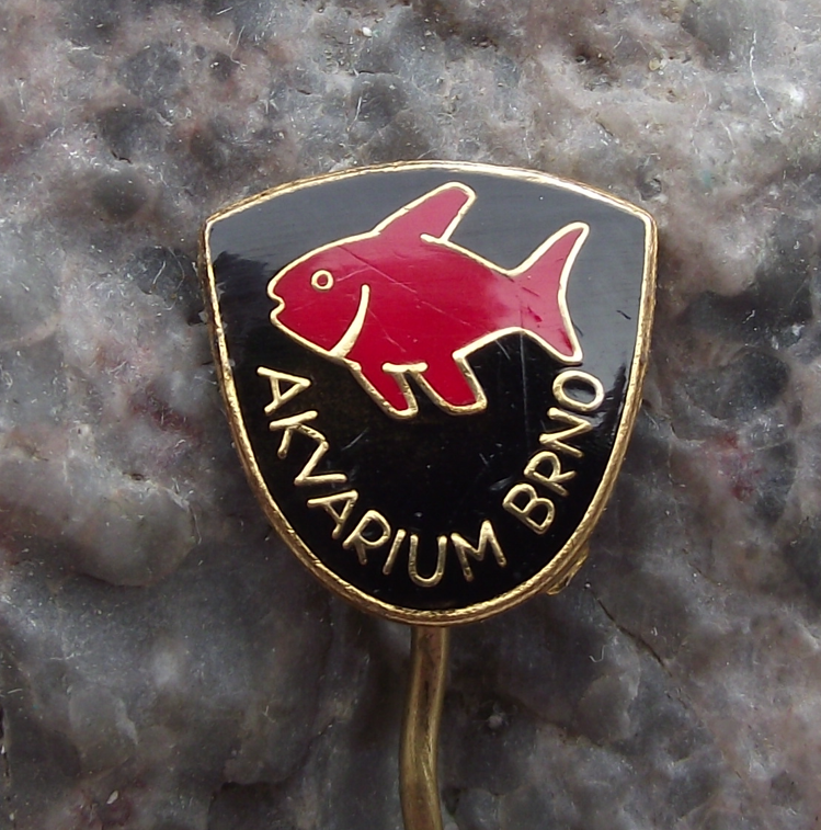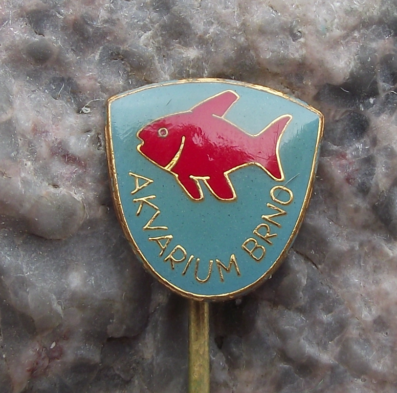 - A gold coloured, metal badge 1.4cm high with a long, stick pin style fastener to the rear. Featuring a tetra style fish and the text Aquarium Brno.