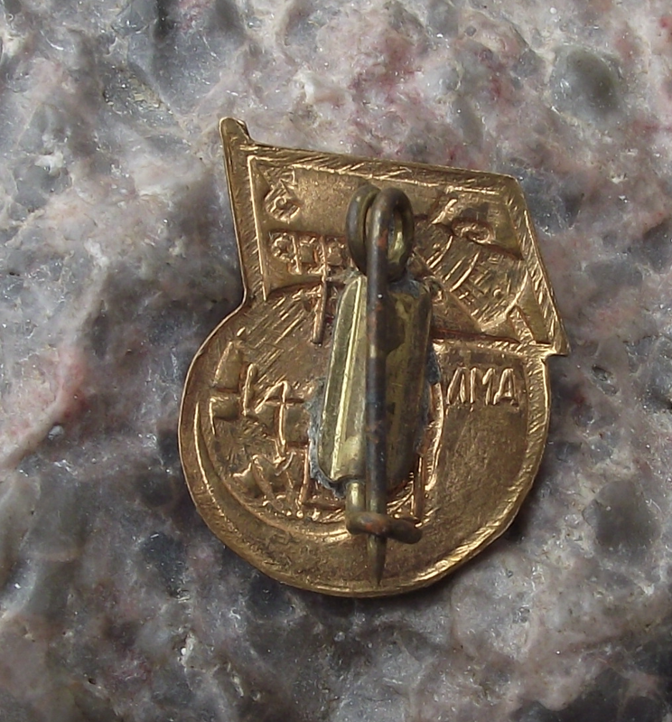 This is a very pretty 1958 Sputnik 3 pin badge celebrating the successful launch of this space probe. A gold coloured metal badge, the badge face is 1.8cm along the longest length and has a clasp style fastener to the rear. Featuring Sputnik as it actually looked orbiting the Earth below.