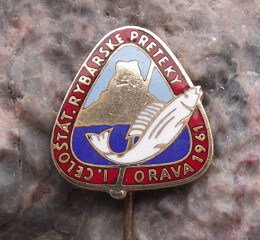 - A pretty, vintage gold coloured metal pin badge from Orava in former Czechoslovakia. It is a badge from the 1961 1st All State Angling Contest.