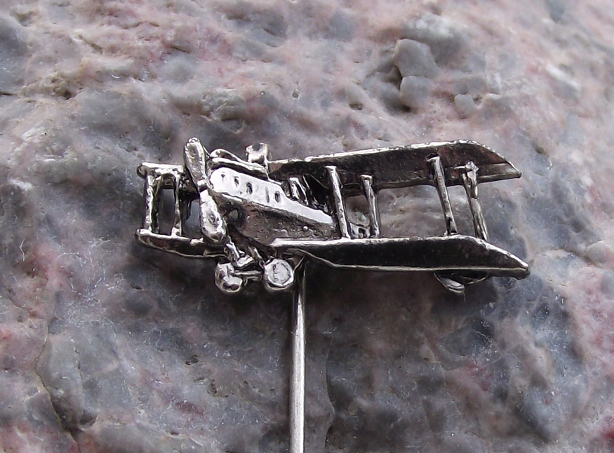 A silver coloured metal, pin badge advertising CSA or Czech airlines and featuring the Aero A.14 that became the very first aircraft in the CSA fleet
