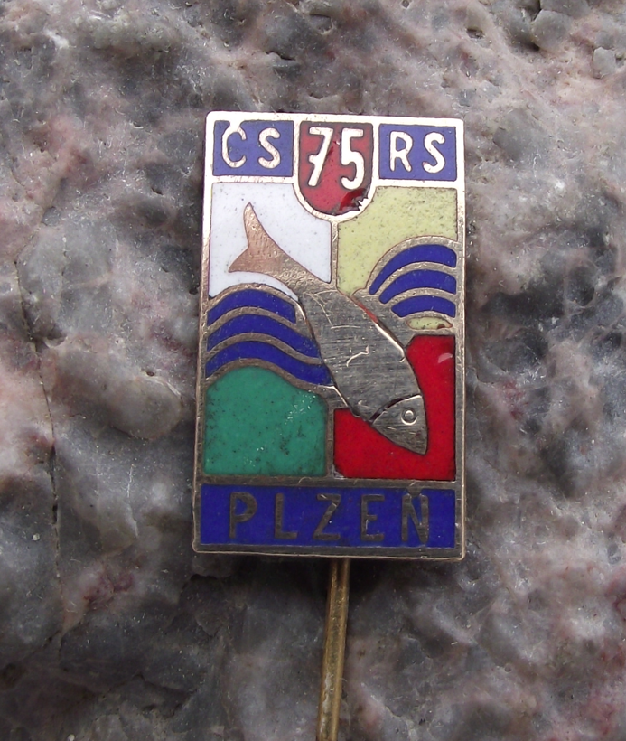 - A pretty, 1965, gold coloured metal pin badge from Plzen in former Czechoslovakia. Denoting membership to the regional angling association and celebrating its 75th anniversary year. The fishing association of Plzen was founded in 1890.