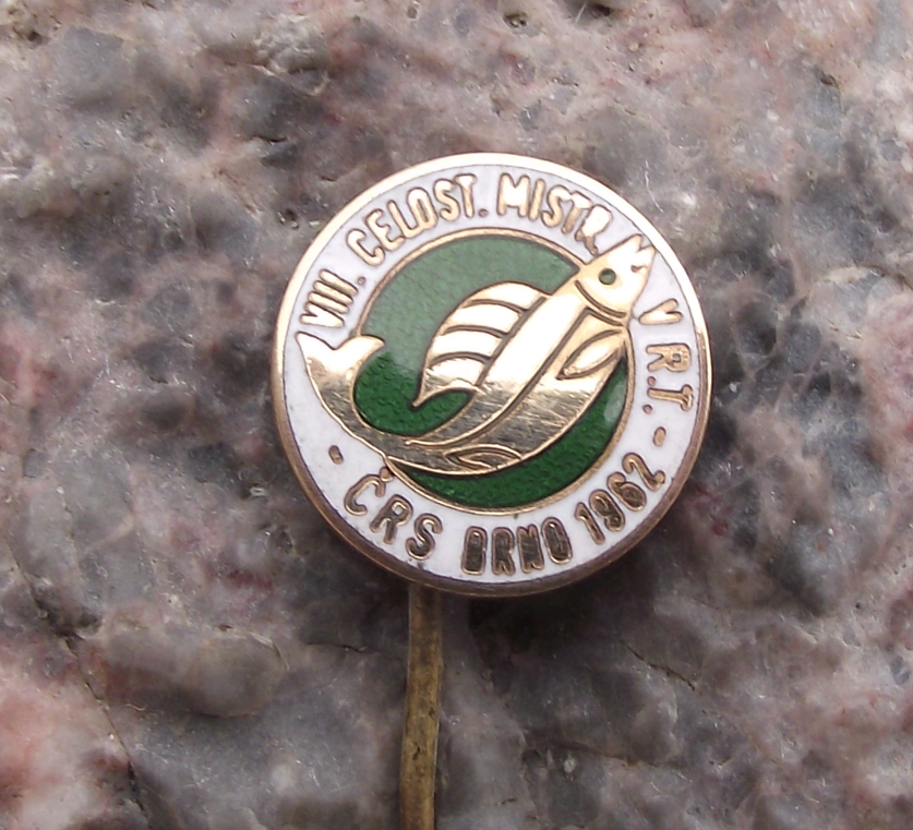 - A pretty, vintage gold coloured metal pin badge from Brno in former Czechoslovakia. It is a badge from the 1962 8th All State Angling Contest.