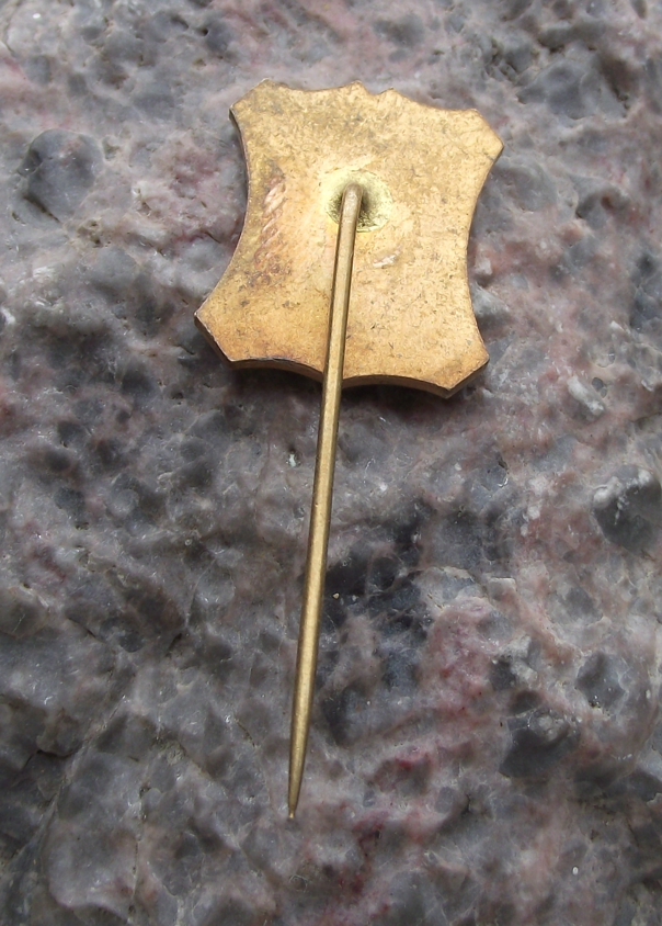 - A vintage gold coloured metal badge 2.1cm high with a long, stick pin style fastener to the rear.