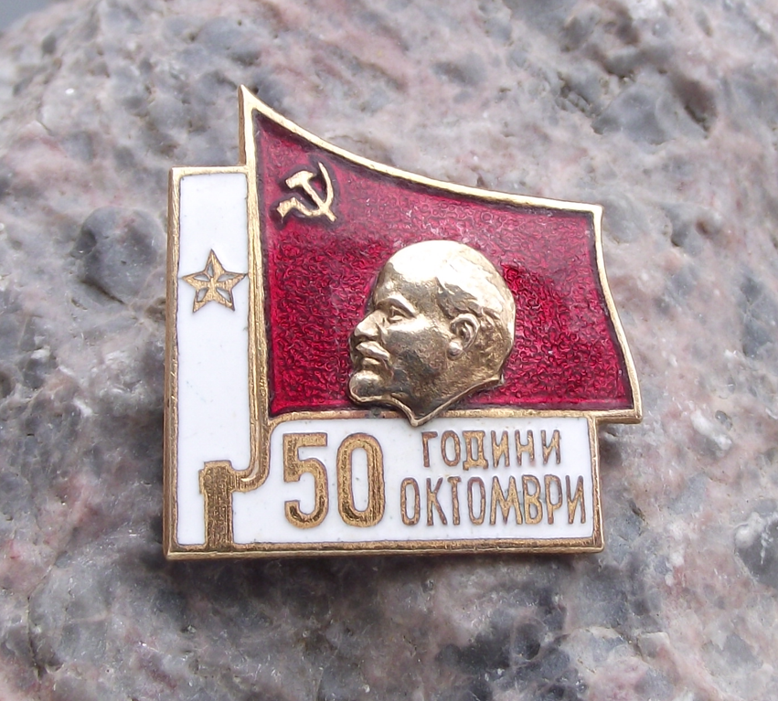 - Featuring Lenin's head over a billowing red flag. The text '50 ГОДИНИ ОКТОМВРИ' translates to '50 YEARS OCTOBER' and celebrates the 50th anniversary of the 1917 October revolution.