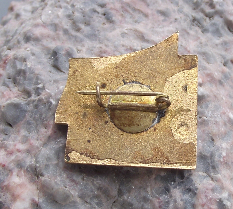 - A pretty, Soviet pin badge, 2.6cm wide, made of a gold coloured metal with a clasp style safety clasp to the rear.