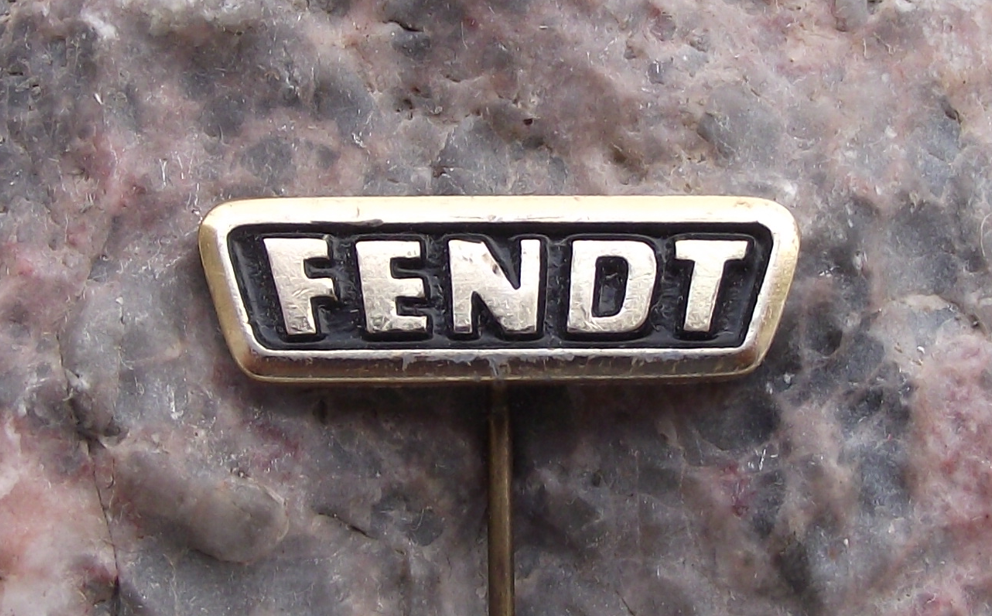A pretty, vintage, silver coloured metal advertising pin badge in good condition from Fendt. The badge face is 2cm in diameter and has a long stick pin style fastener to the rear.