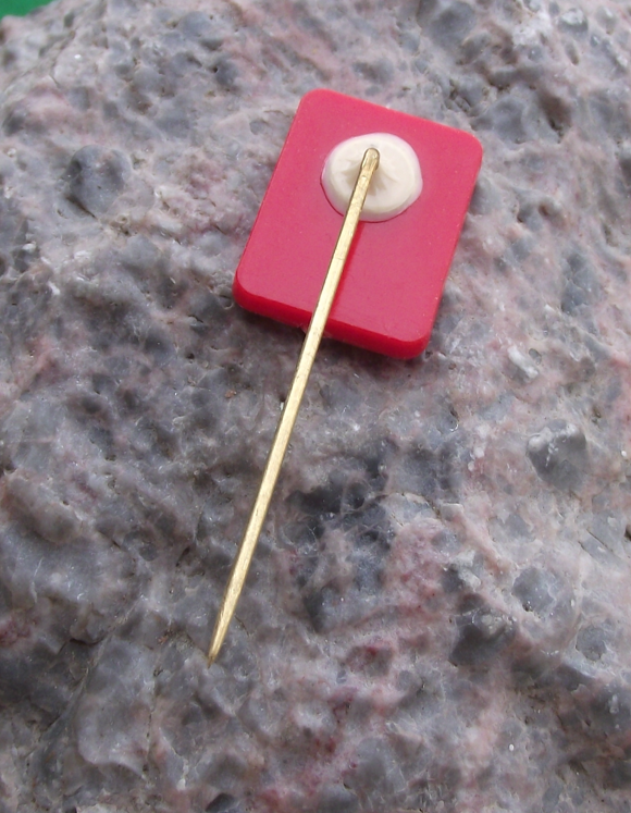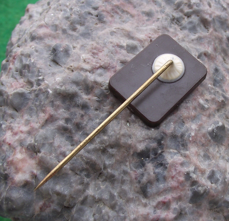 - A vintage plastic badge 2.1cm high with a long, stick pin style fastener to the rear.