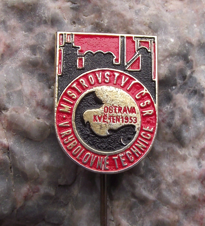 - A pretty, vintage gold coloured metal pin badge from Ostrava in former Czechoslovakia. It is a badge from the May 1953 National Fishing championships.
