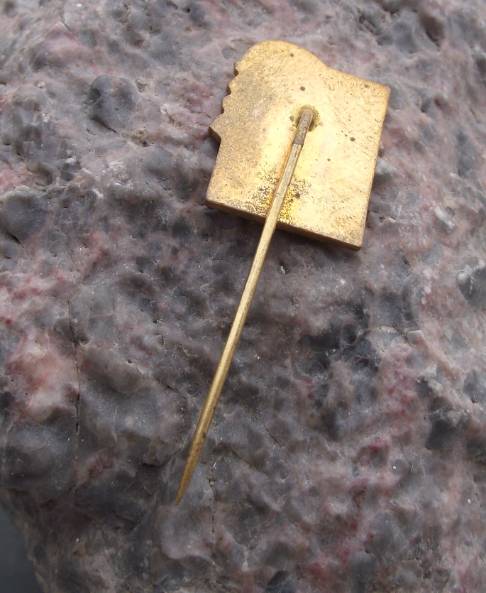 - A gold coloured, metal badge 2cm high with a long stick pin style fastener to the rear.