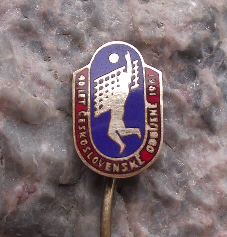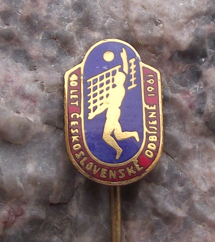 - A very pretty, 1961 pin badge made to celebrate the 40th anniversary of volleyball in former Czechoslovakia. It is made from a gold coloured metal. The badge face is 1.5cm high and has a long, stick pin fastener to the rear.