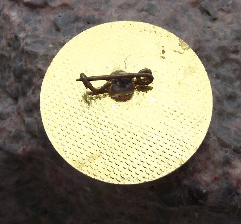- A vintage gold coloured metal badge 3cm wide with a safety clasp style fastener to the rear.