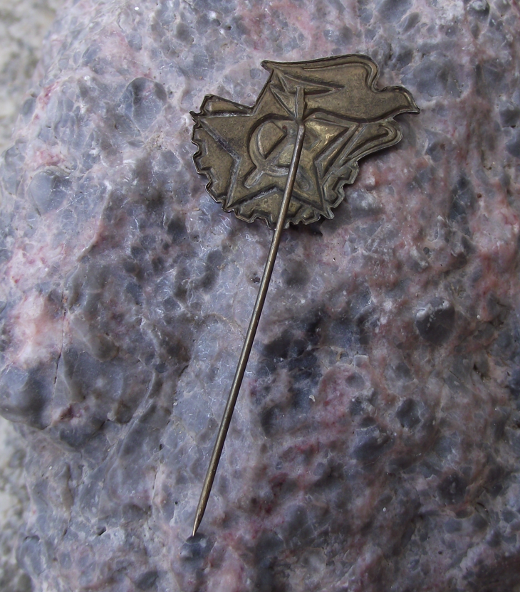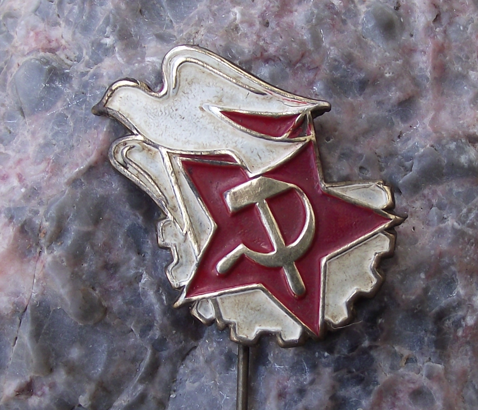 - A gold coloured, metal badge 2.6cm wide with a long, stick pin style fastener to the rear. Featuring a red Soviet star with hammer and sickle motif and the white dove of peace.