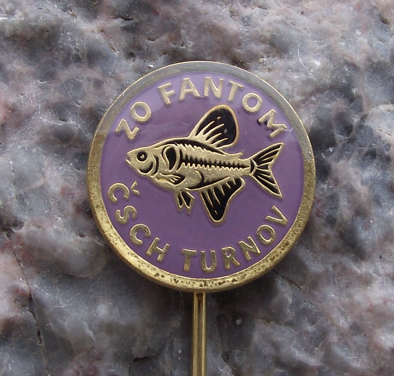 - A vintage, gold coloured pin badge, from former Czechoslovakia advertising the Turnov tropical fish club in former Czechoslovakia. The badge face is 1.6cm in diameter and has a long, stick pin style fastener to the rear.