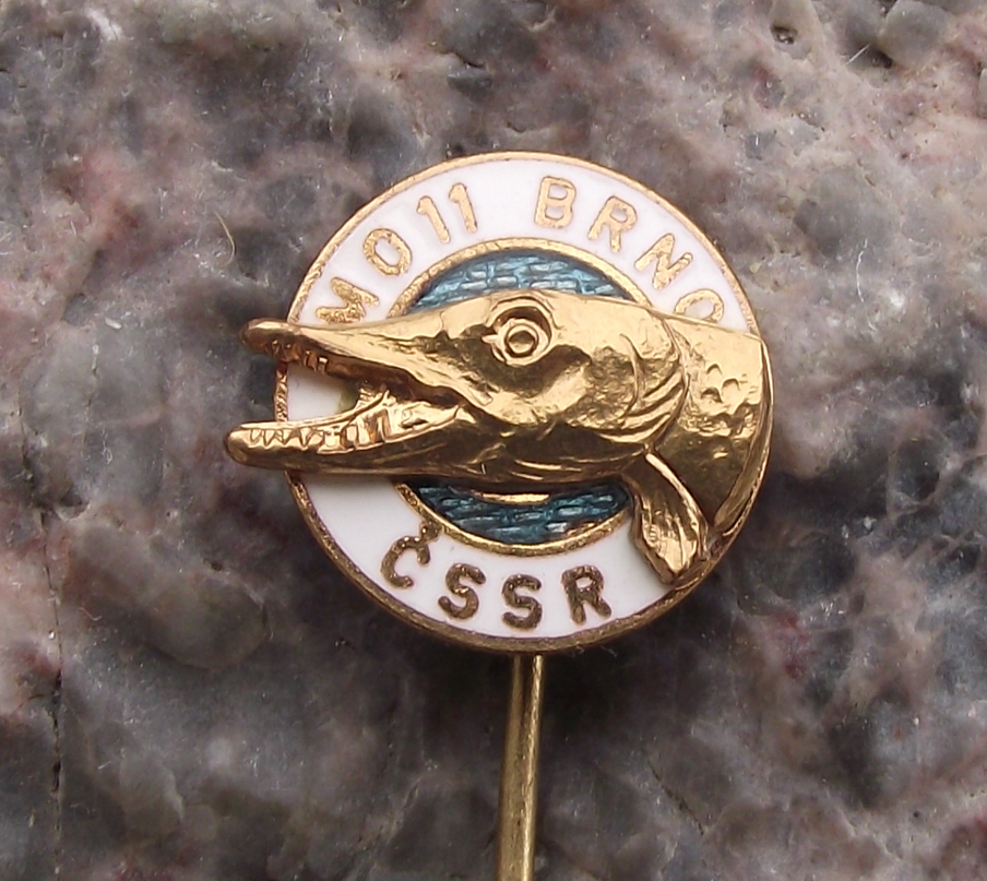 - A pretty, vintage, gold coloured metal pin badge from Brno in former Czechoslovakia. Denoting membership to the regional angling association.