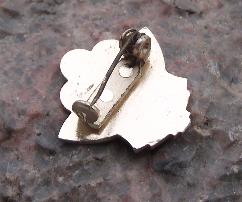 - A silver coloured metal badge with a 2cm wide badge face and a safety clasp style fastener to the rear.