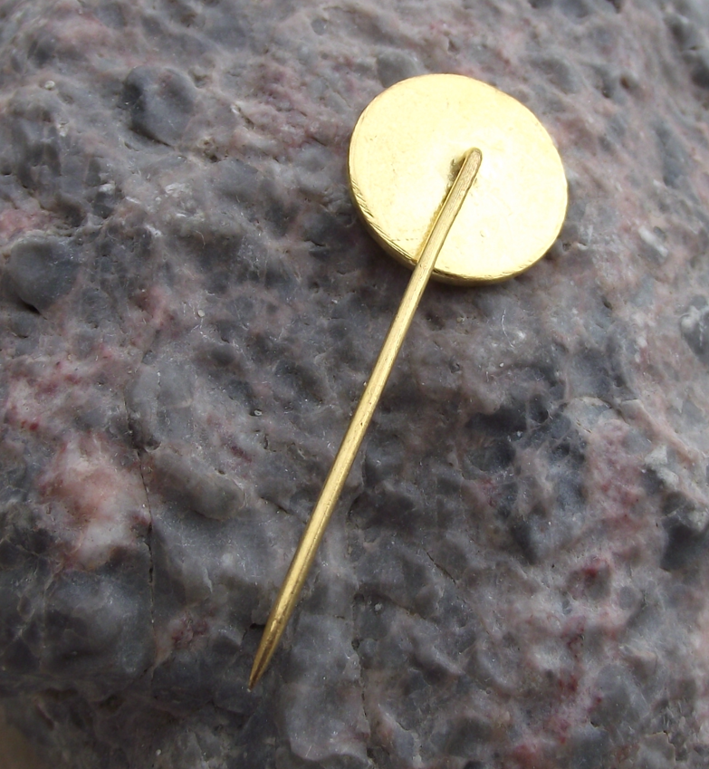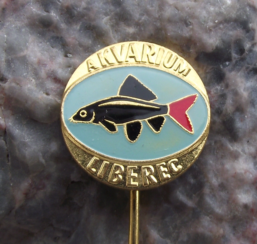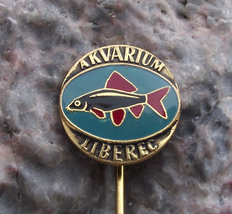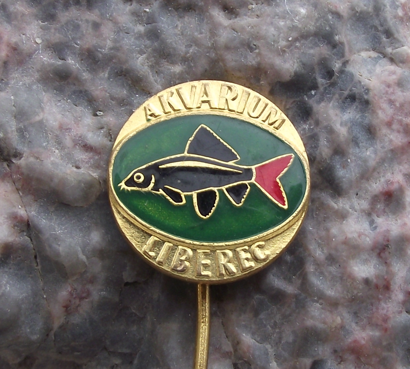 - A vintage, gold coloured metal pin badge, from former Czechoslovakia advertising an aquarist club in Liberec. The badge face is 1.5cm in diameter and has a long, stick pin style fastener to the rear.