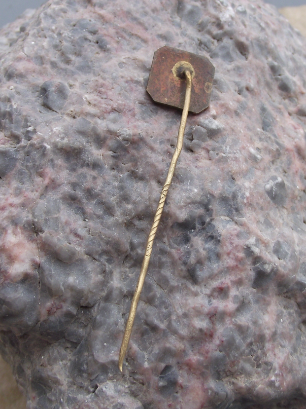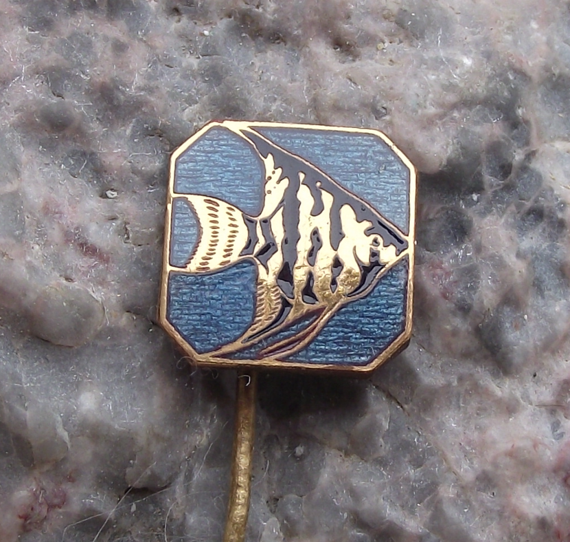 - A gold coloured pin badge, from former Czechoslovakia advertising a show or club that keep angelfish. The badge face is 1.1cm high and has a long, stick pin style fastener to the rear.