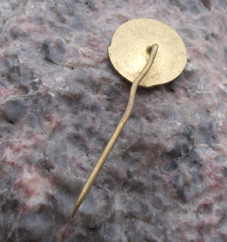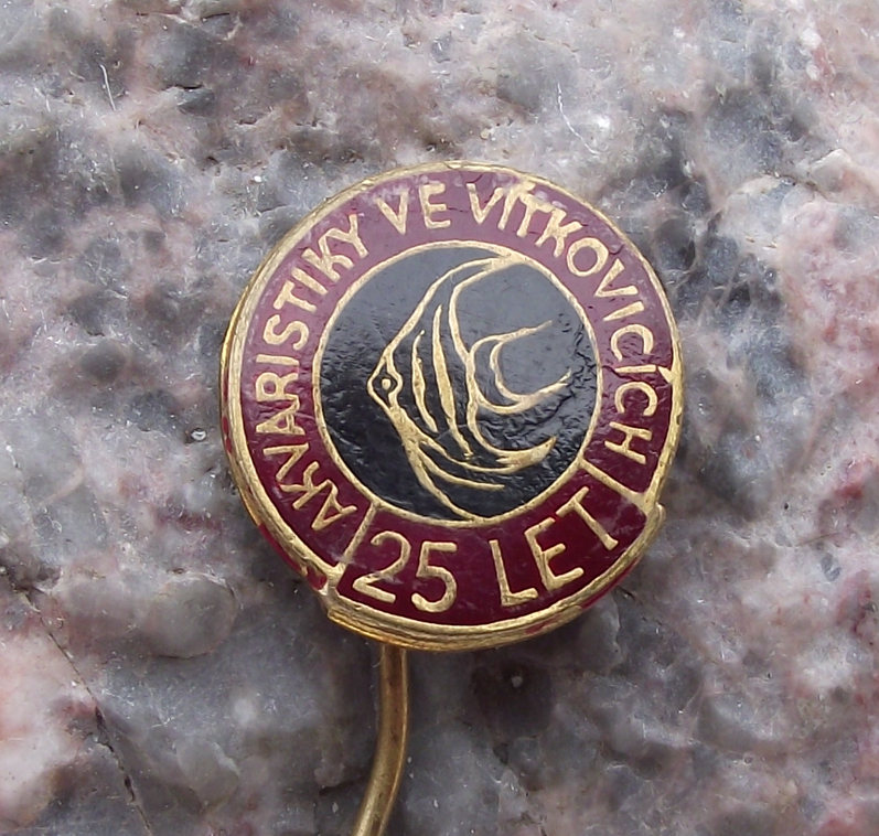 - A vintage, gold coloured pin badge advertising the tropical fish club of Vitkovice in former Czechoslovakia. The badge face is 1.6cm high and has a long, stick pin style fastener to the rear.