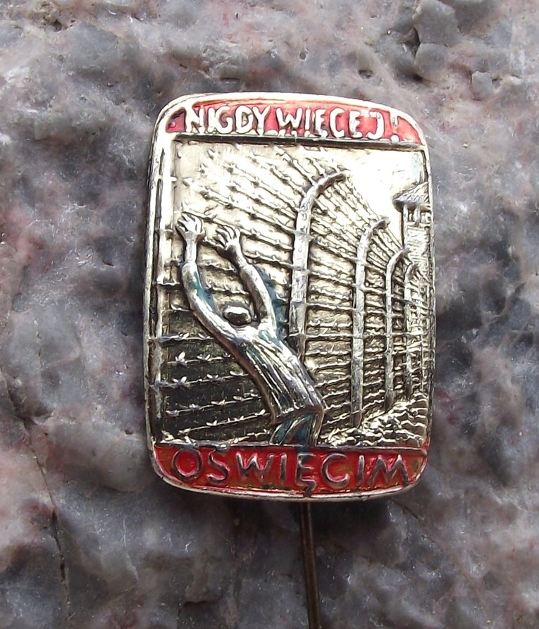 Vintage Auschwitz Birkenau Concentration Camp Never Again Slogan Pin Badge