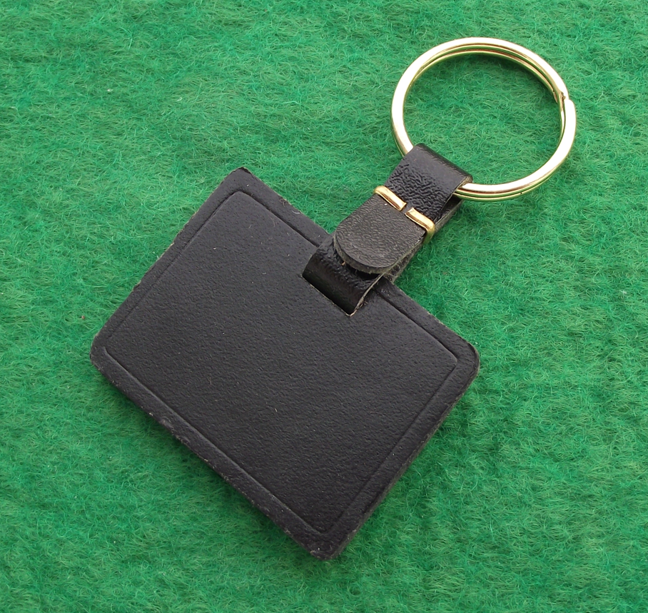 - A rare silver coloured, metal and leather keyring 7.2cm high in total, inclusive of the ring. The leather fob part is 4cm wide and it has a compression fastener on the ring.