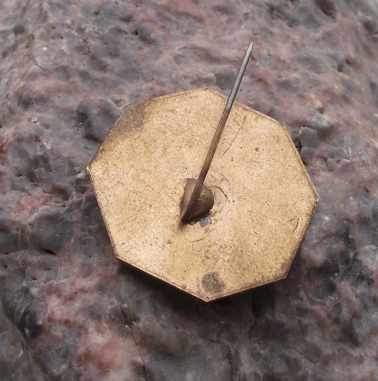- A vintage metal badge 2.5cm in diameter with a long stick pin style fastener to the rear.