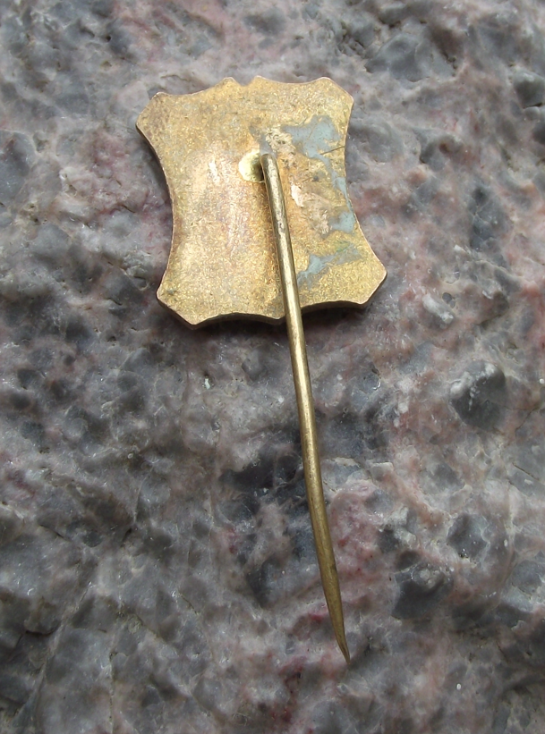 - A vintage gold coloured metal badge 2.1cm high with a long, stick pin style fastener to the rear.