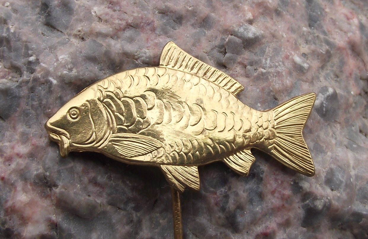 - A large, vintage, gold coloured metal pin badge from former Czechoslovakia. Denoting membership to the angling association.